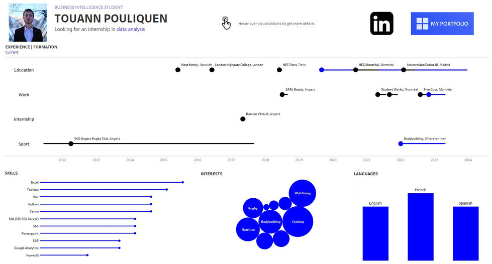My name is Touann, I am currently doing my last semester at HEC Montreal's Bachelor of Business Administration, specializing in Business Intelligence.